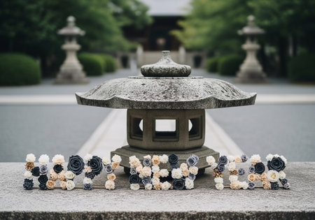 Tranquil Zen Garden with Traditional Asian Architecture Pavilion Lantern and Raked Gravel Path in Peaceful Nature Landscape for Meditation and Contemplation