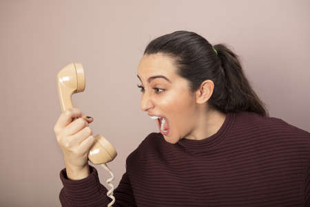 Frustrated angry woman screaming at the telephone as she grips a corded land line instrument in her hand