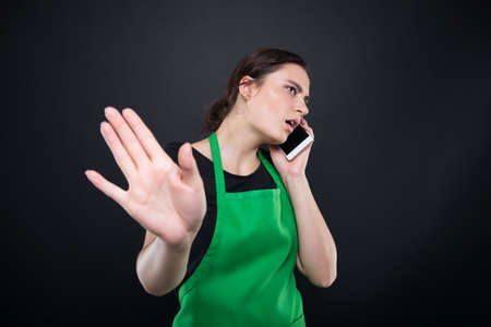 Supermarket seller talking business on the phone looking very busy on dark background