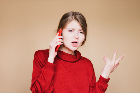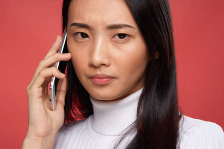 sad asian woman talking on the phone close-up red background