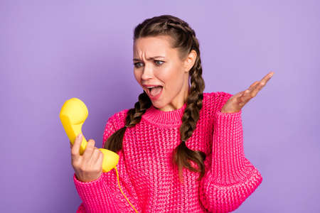 Photo of young beautiful unhappy upset aggressive girl having conflict on phone isolated on purple color background