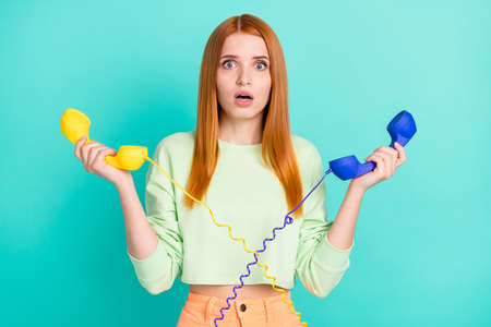 Photo of stressed millennial lady hold phones wear sport clothes isolated on vivid teal color background