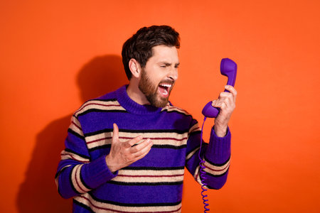 Frustrated young man shouting into a purple phone against a vibrant orange background