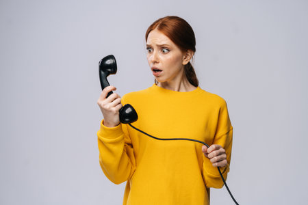 Scared shocked young woman wearing stylish yellow sweater talking on retro phone against isolated white background. Pretty redhead lady model emotionally showing facial expressions.