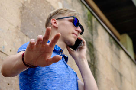 Portrait of young man in sunglasses talking on the phone. Man of European race with gesture of his fingers asks not to distract him during telephone conversation. Lifestyle. Selective focus.