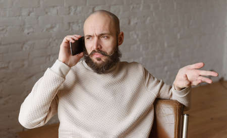 white bald man with a beard is talking on the phone in the room