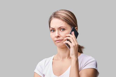 Pretty female portrait. Woman talking by mobile phone. Cute conversation concept. Commuter device. People emotion. Shoked face. Grey background. Copyspace. White t-shirt