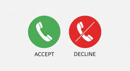 Close-up of a hand holding a smartphone with an incoming call screen. Display shows Incoming call with green accept and red decline buttons