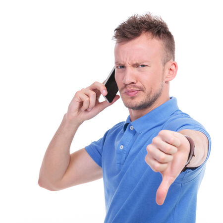 picture of a young casual man speaking on the phone and showing the thumb down gesture while looking into the camera. isolated on a white background