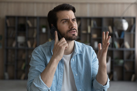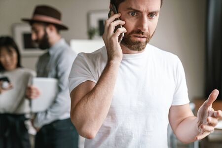 Unhappy young Caucasian man talk speak on smartphone distressed with negative response online. Stressed upset male have cellphone call, feel frustrated disappointed with bad news or message.