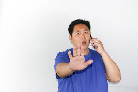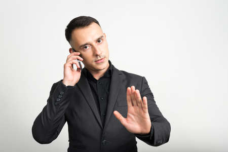 Businessman talking by smartphone and show stop gesture sign by hand with stop sign virtual screen. Warning and alert attention signs. Human emotion face expression concept. isolated gray background.