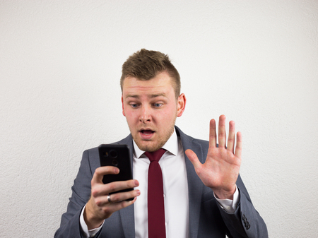 Young, caucasian and handsome businessman worried and surprised by a text message he got on the mobile and typing an answer to it.