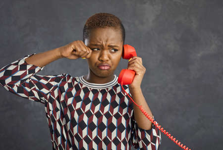 Portrait of unhappy capricious african american woman crying while talking on landline retro phone. Frowning woman holding a red handset and wipes tears while standing on a gray background.