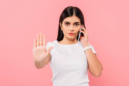 pretty brunette girl talking on smartphone and showing stop gesture isolated on pink