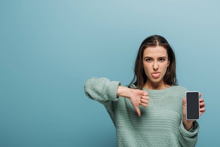 woman sticking tongue out while showing thumb down and smartphone with blank screen, isolated on blue