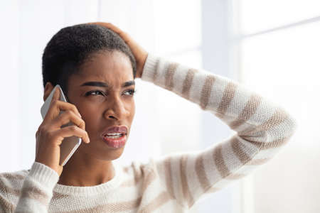 Who Is Calling. Confused African Lady Talking On Cellphone And Touching Head