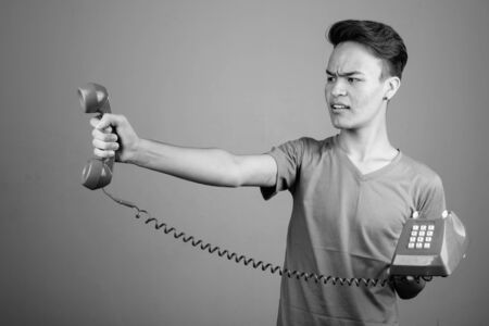 Portrait of stressed Asian tourist man talking on the phone