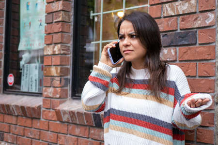 Mexican woman happily calling in front of Canadian brick building
