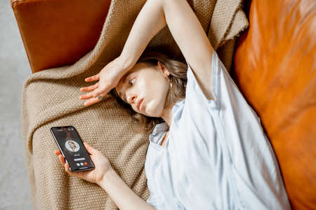Young woman sitting at home on the couch with a severe headache, trying to call a doctor with a phone, and find a solution to the problem in an online consultation