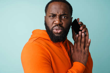 Displeased african american man looking at camera while talking on cellphone isolated over blue background