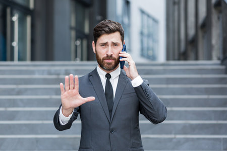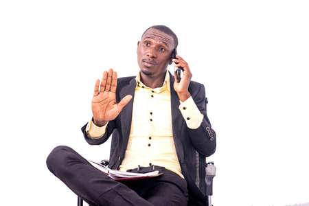 portrait of a businessman sitting on a chair and talking on mobile phone while making a stop gesture with his hand.