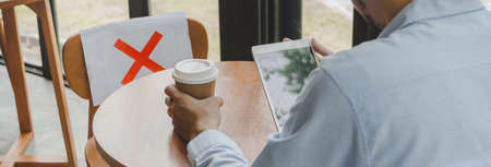 wide banner. businessman using mobile tablet on desk sitting with paper sign on seat and keep distance to protect infection in cafe restaurant, social distancing concept