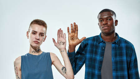 Stop shaming. Racial tolerance. Respect social unity. African and caucasian hands gesturing on gray studio background. Human rights, friendship, intenational unity concept. Interracial unity.