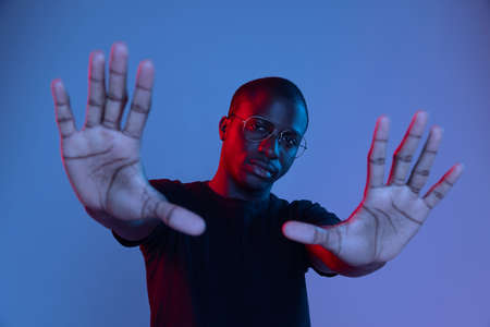 Stop gesture. Black male in selective focus. Angry African American man, facial expression, not guilty guy on dark background, emotional photo, protection concept