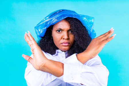 unhappy female with plastic bag on her head against blue wall studio