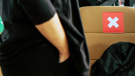 Social distancing, Rows of empty chairs in an airport's departure area marked with symbols regarding social distancing protocol to prevent the spreading of novel corona virus, COVID-19 in Thailand