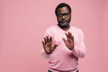 Black displeased man in eyeglasses making winner stop gesture isolated over pink background