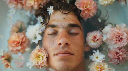 Attractive young hispanic man in water with fresh flowers image, ai generated. Relaxed latino male taking herbal bath photography scene wallpaper. Beauty spa salon concept photorealistic photo