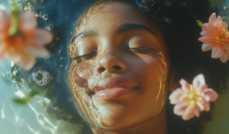 Serene woman with closed eyes surrounded by soft flowers in a dreamy bath setting, exuding tranquility and natural beauty, perfect for wellness and self care themes
