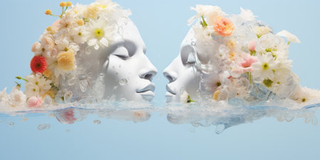 Two white heads with flowers reflected in water, conceptual image of love