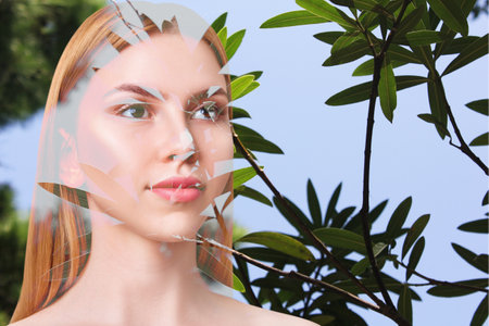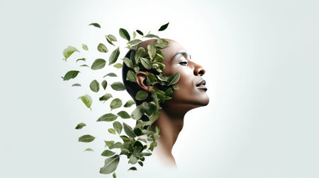 Female portrait with green leaves integrated, symbolizing natural beauty and harmony with nature Ideal for health and wellness themes