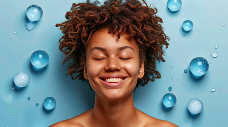 A woman with curly hair is smiling while surrounded by bubbles, exuding happiness and positivity.