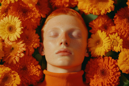 A young model with short red hair in a turtleneck sweater resting amid vibrant orange and yellow flowers, exuding calmness and serenity