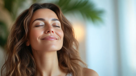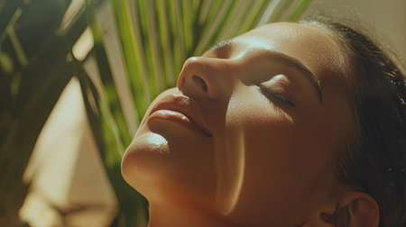 A peaceful close-up portrait of a woman enjoying warm sunlight in an indoor setting, surrounded by greenery, radiating natural beauty and tranquility. Perfect for wellness themes.