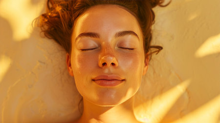 A close-up portrait of a serene woman basking in relaxation, illuminated by soft light, embodying tranquility and natural beauty near water, inviting a sense of peace.