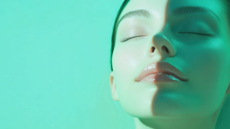 This serene image features a woman with closed eyes, basking in calming green light that highlights her smooth skin and relaxed expression.