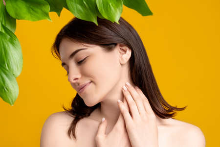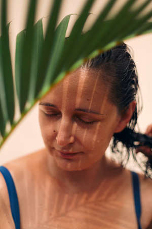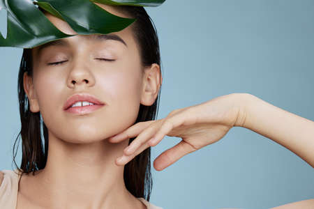 Portrait of a beautiful girl with bare shoulders without retouching with her natural imperfections. Above is a green branch of the Hovea palm tree. Palm tree gives clear shade