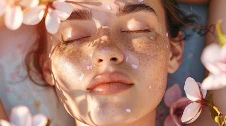 Woman gently touching their face, surrounded by fresh flowers in soft pinks and greens. The close-up captures light reflections on the skin. Generative AI