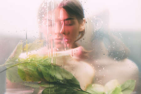 Creative portrait. Spa therapy. Sensual woman face blur silhouette with green leaves behind steamed glass with rain drops double exposure effect. Skin care. Beauty wellness.