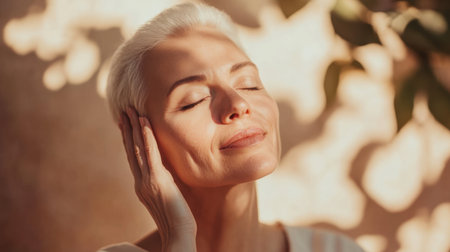 A calm and serene woman experiences the warmth of sunlight, surrounded by soft shadows, reflecting tranquility and inner peace in a beautiful natural setting.