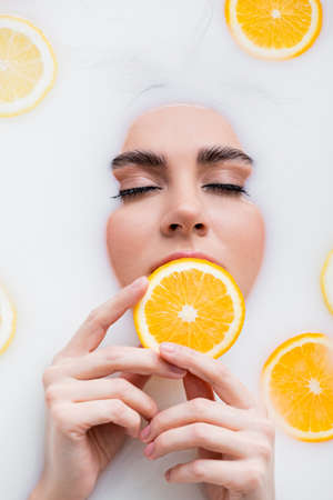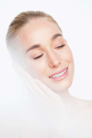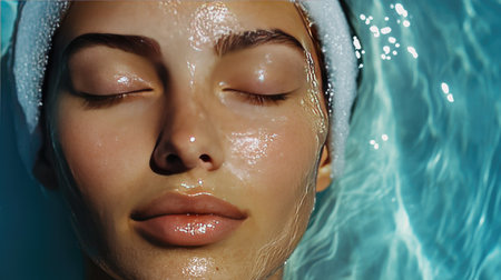 Close-up of white woman with closed eyes surrounded by splashing water, serene and refreshing ambiance