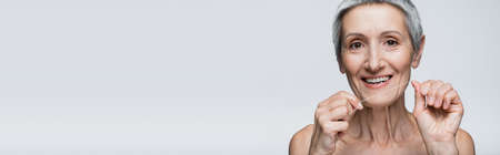positive middle aged woman with grey hair holding dental floss isolated on grey, banner