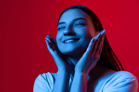 Cropped portrait of cute young beautiful woman in white T-shirt posing isolated over red background in neon lights