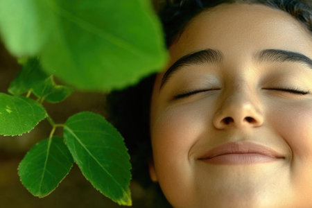 Contented Smile with Closed Eyes Near Green Leaves - Peaceful and Joyful Moment.