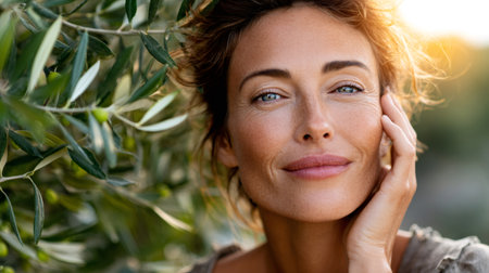 Woman touching her face, enjoying natural beauty and sunlight with olive leaves