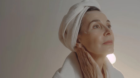 A beautiful middle-aged woman touches a smooth area of skin on her neck, a beautiful mature woman is wrapped in a towel and enjoying her beauty on a light grey background, including space for copy,